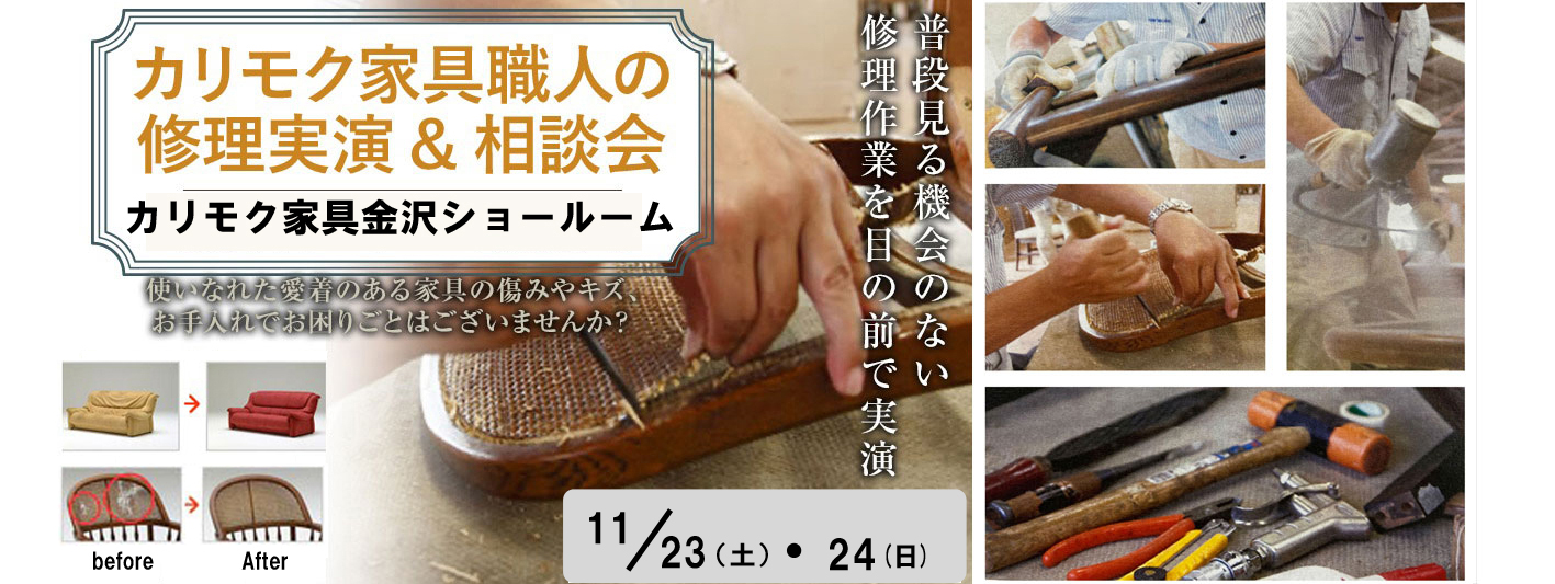 不定期開催しております修理実演会を【カリモク 金沢ショールーム】 にて行います。
